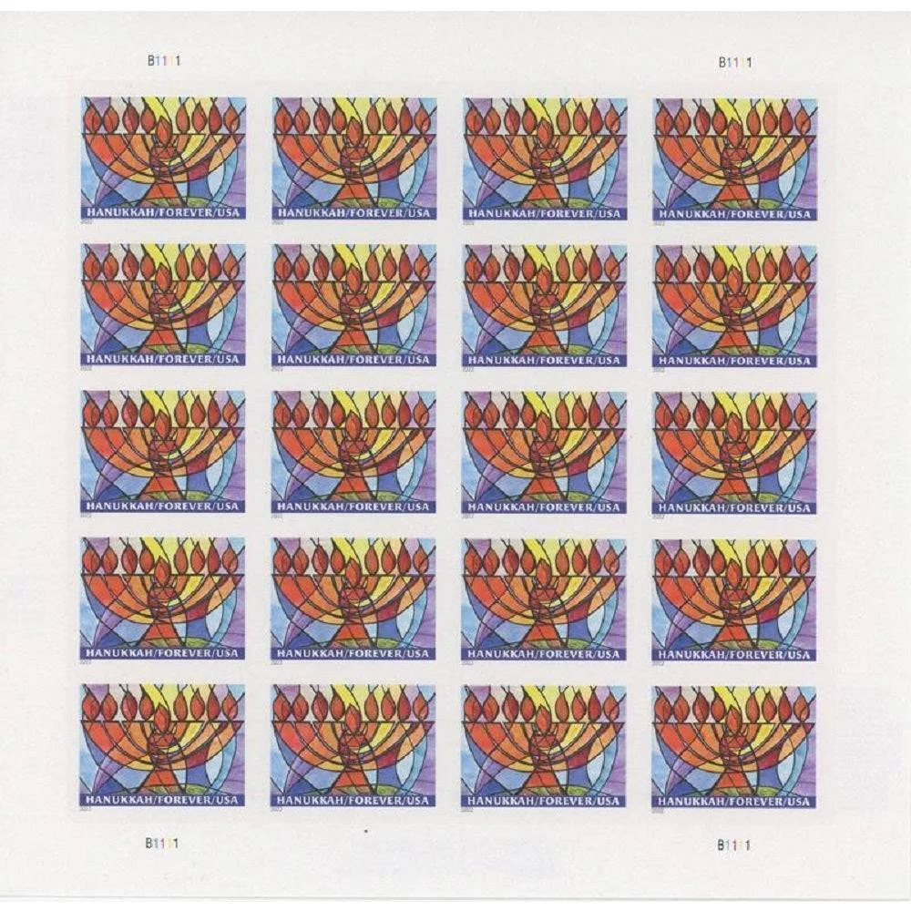 The 2022 Hanukkah Forever® Stamps feature a beautiful menorah design to light up your seasonal mail. These genuine Forever stamps are the standard choice for Jewish holiday cards and community newsletters, conveying a sense of tradition and celebration for the Festival of Lights.