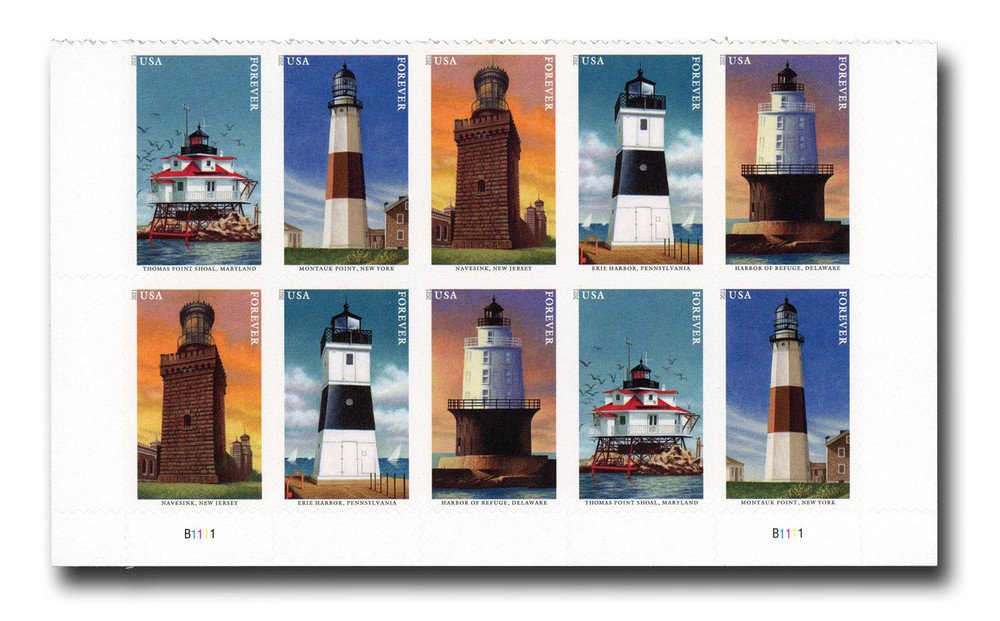Mid-Atlantic Lighthouses 2021 USPS Forever Stamps feature scenic lighthouse imagery.
